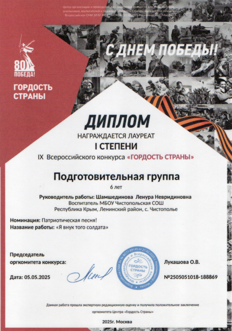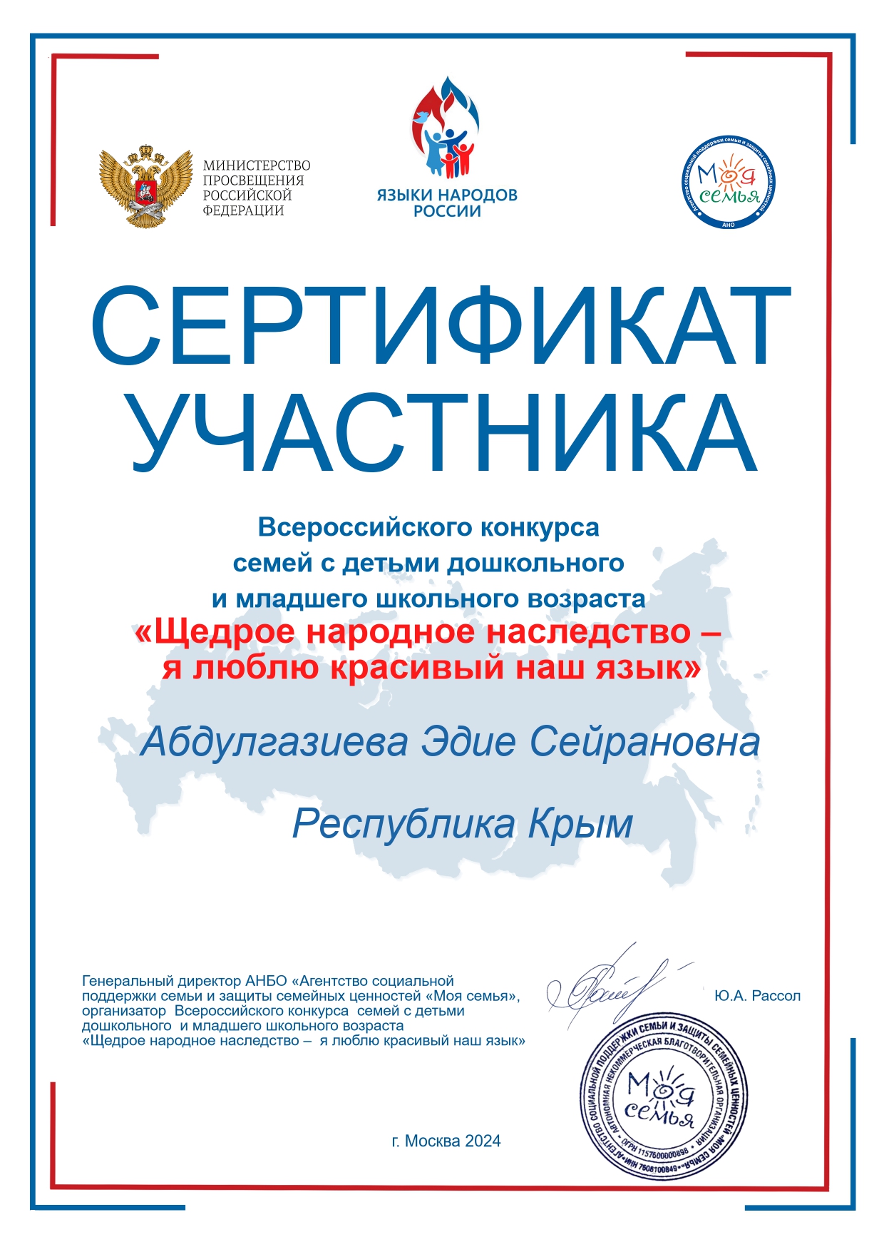 Во всероссийский конкурсе семей с детьми дошкольного и младшего школьного возраста "Щедрое народное наследство - я люблю красивый наш язык" приняла участие воспитанница МБОУ Чистопольской СОШ Ленинского района Республики Крым Структурного подразделения «Детский сад «Алёнка» Абдулгазиева Эдие Сейрановна со стихотворением «Гузель Къырым»#родныеязыкиРФ